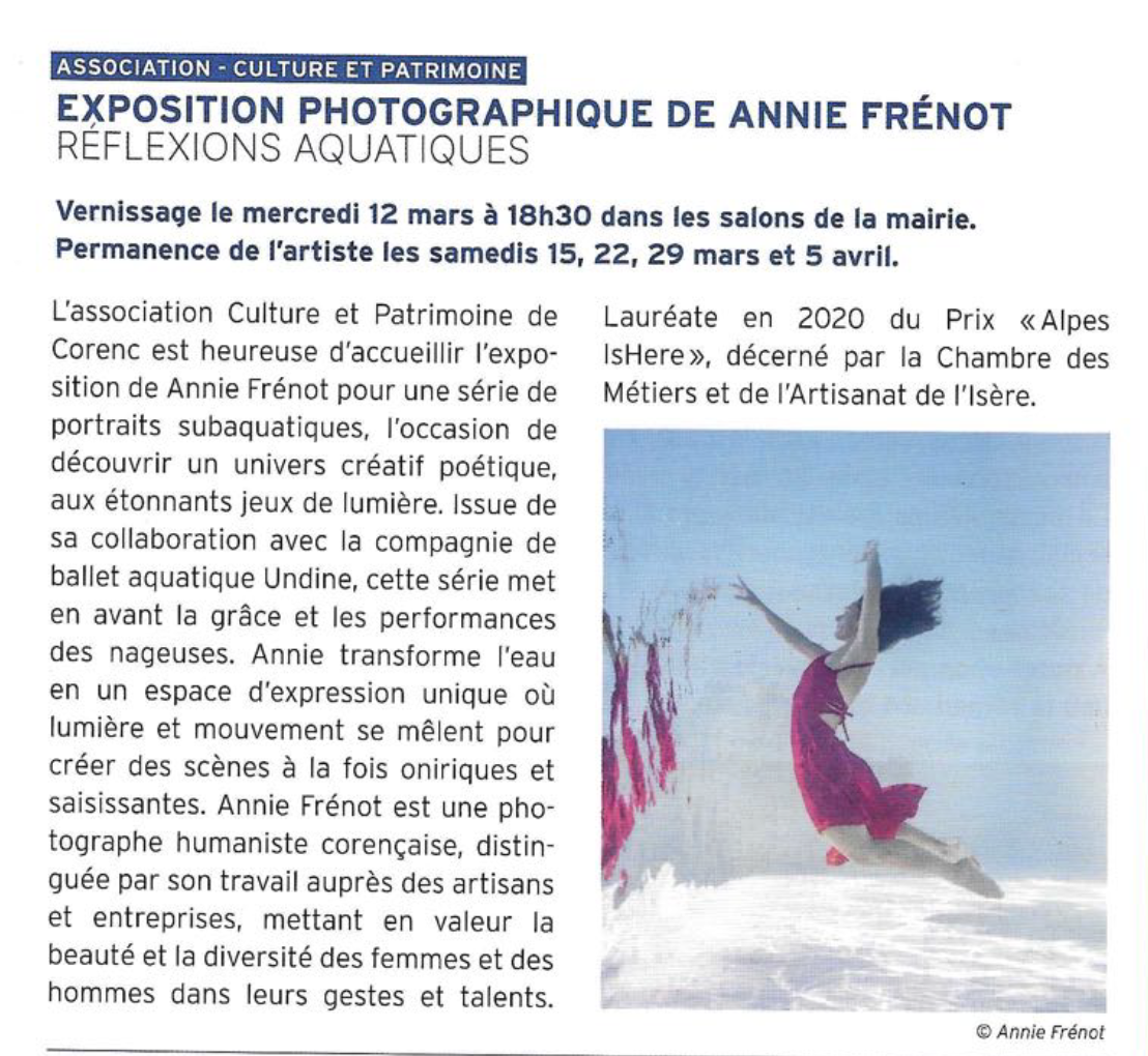 Du 12 mars au 5 avril 2025, la mairie de Corenc a accueilli Réflexions Aquatiques, une exposition de portraits subaquatiques. Quatre semaines intenses, riches en rencontres et en émotions, qui ont permis de faire connaitre mon univers de photographe aquatique en Isère à un public intéressé (et oui !)